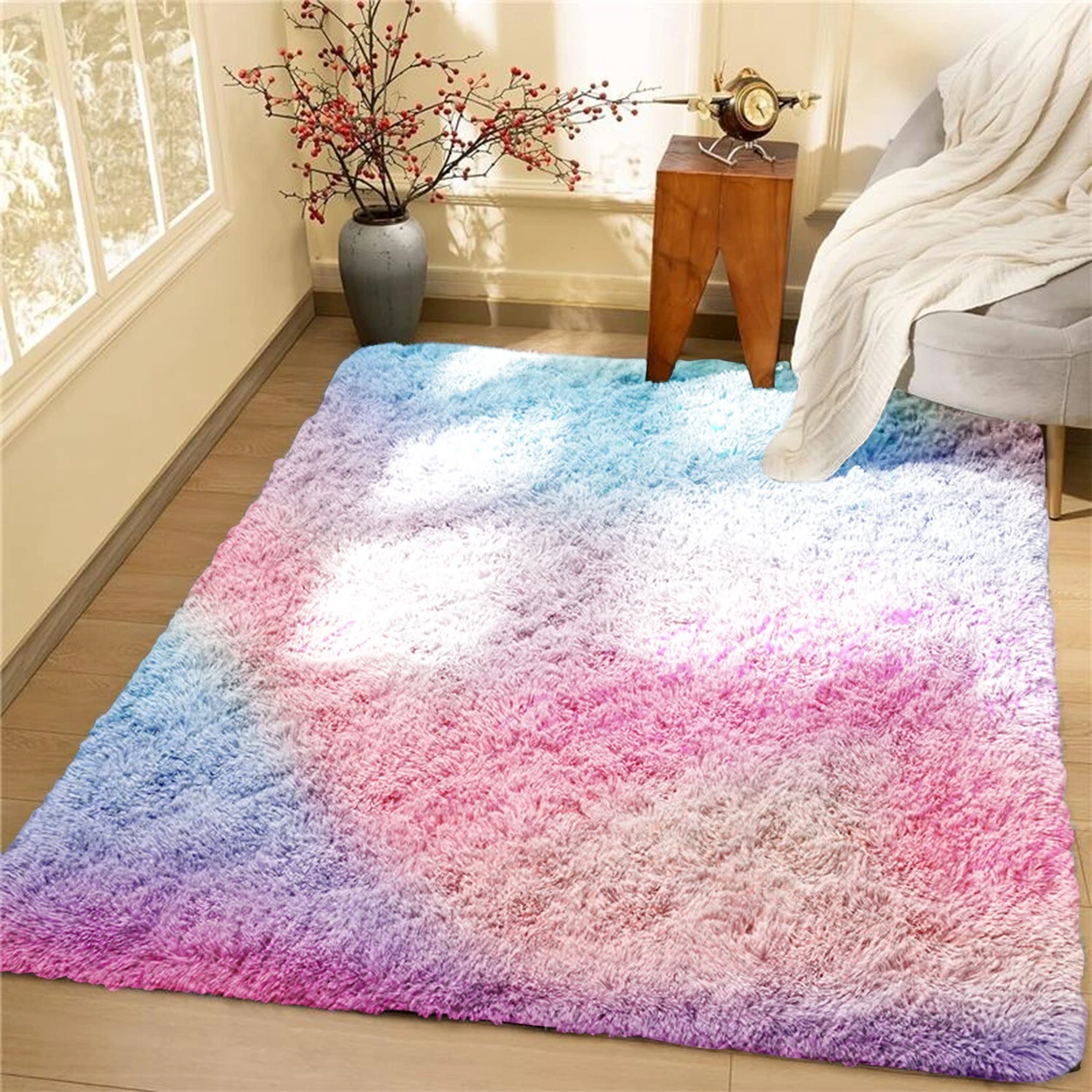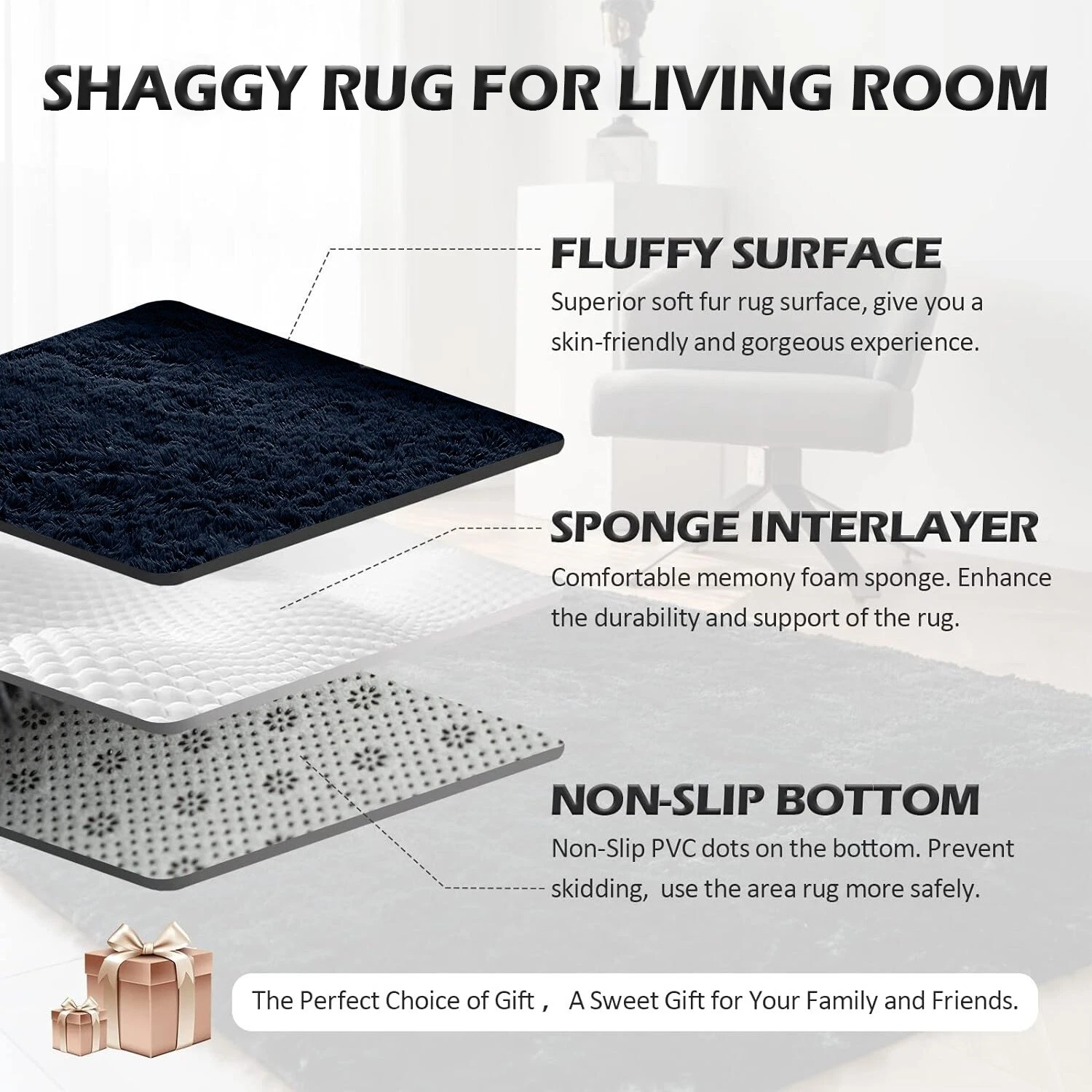 Upgraded Non-Slip Backing: The tight weaving process ensures that the fuzzy carpets are non-shedding and the edges are not easy to fall apart. The living room throw rug is covered with thousands of plastic beading dots, it can help to increase the friction between the carpet and the floor, keeping the rug stays in place. Anti-slip and does not harm the floor.
